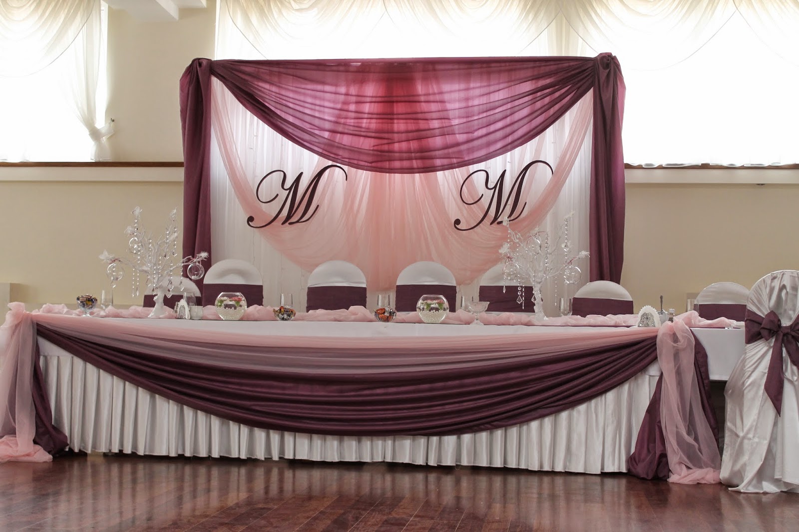 Tło białe, podświetlone kurtyną świetlną , boki rozciągnięte , środek kremowa tkaniną z czerwonym sercem ,inicjały p.Młodych.Stół opięty szyfonowymi falbankami flamenco ,podświetlony.